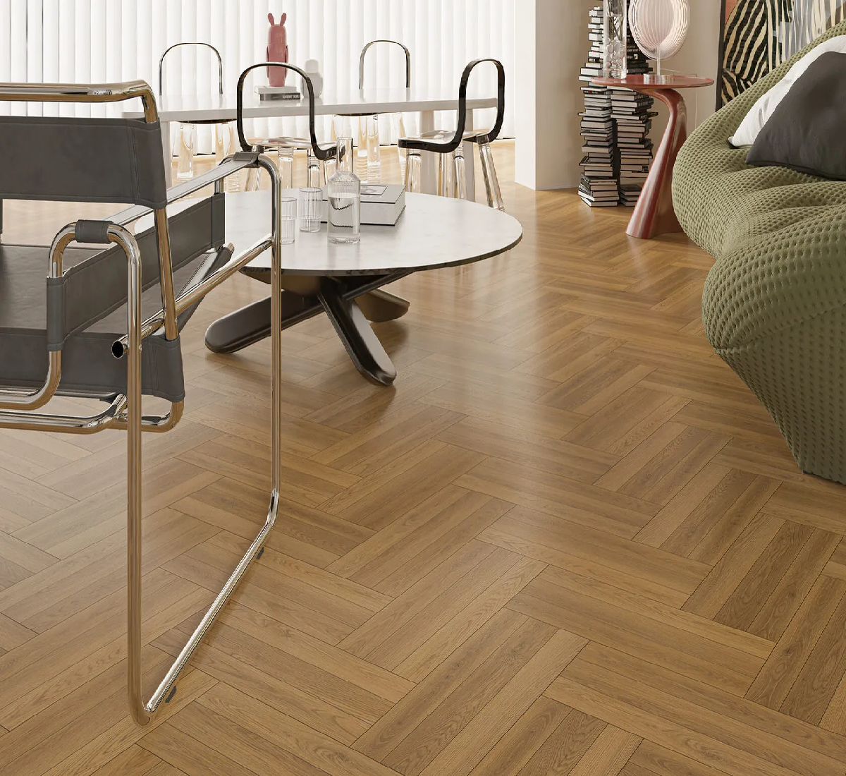 Премиальный ламинат 34 класса износостойкости, толщиной 12 мм. «быстрая ёлка». Поверхность матовая. Тиснение в регистр, повторяет структуру дерева. Материал – высокоплотная (880 кг/ м³), водостойкая черная плита HDF, созданная по новейшим технологиям. Дополнительная обработка замков по периметру воск силиконом от влаги. 4 сторонняя V образная фаска.Размер доски 600-238-12 мм.В одной упаковке 14 досок (2 м²). Замок Herringbone Click AB. Ламинат для Совместим с системой теплый пол.