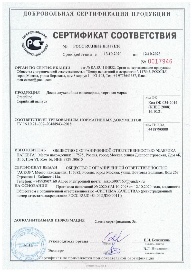 Greenline — Российский производитель доски с техническим оснащением из Швейцарии. Основное направление фабрики – выпуск высококачественного паркета, инженерной и массивной доски по новейшим технологиям. В работе используется только отборная древесина, а также составляющие компоненты без вредных примесей и формальдегидов, что гарантирует экологичность материала и его применение в жилых, бытовых, медицинских и общественных помещениях любой площади. Завод функционирует по принципу производства полного цикла – от заготовки древесины (кавказский лес) до упаковки готовой продукции. Для облегчения укладки, планки в упаковке разной длины.
