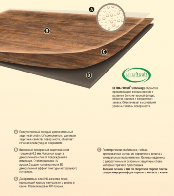 Бельгийская компания Vinilam является одним из известнейших производителей напольных покрытий. Виниловый пол этого бренда обладает превосходными эксплуатационными и эстетическими характеристиками. Его основой является прочный винил, имеющий верхнюю часть с фактурой натуральной древесины. Поверхность винилового пола обработана надежным защитным покрытием, в составе которого имеется оксид алюминия. Благодаря этому отделочный материал обладает ударопрочностью, устойчивостью к царапинам и другим механическим повреждениям. Он легко переносит температурные и химические воздействия.
