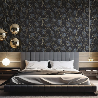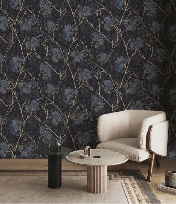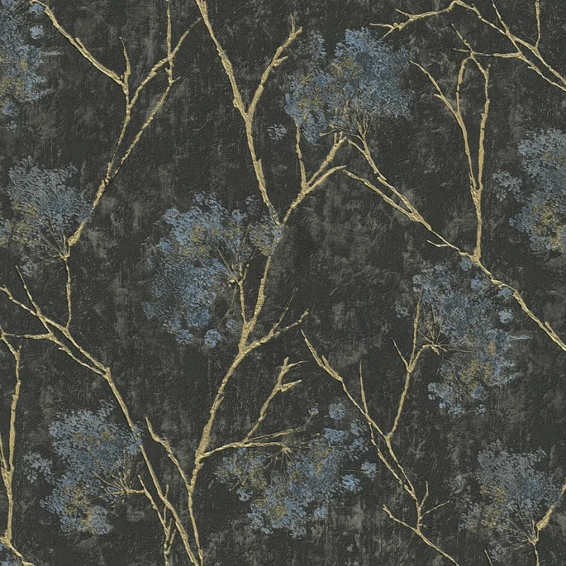 Рулонные обои Emiliana Parati (Эмильяна Парати) 73418 Ветки золото с голубым на черном 1.06х10.05 м. винил на флизелине, Италия