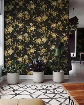 Второй мотив — это роскошный дамаск на текстильной фактуре, имитирующей парчу, поверх которого нанесено жемчужное напыление. Глубину изображению придает