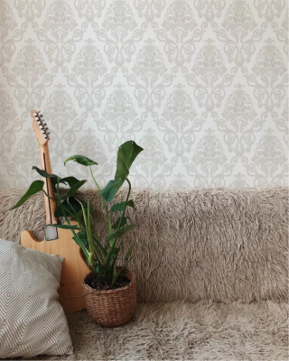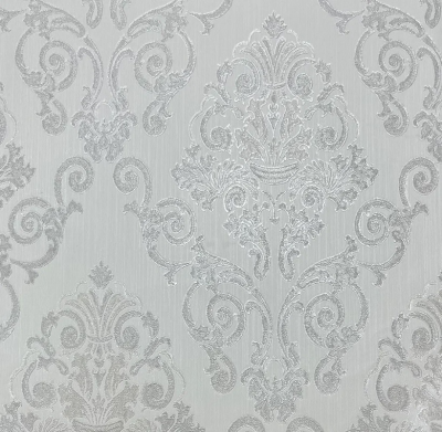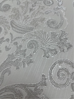 Второй мотив — это роскошный дамаск на текстильной фактуре, имитирующей парчу, поверх которого нанесено жемчужное напыление. Глубину изображению придает