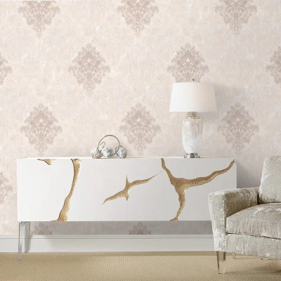 Акцентом второго мотива коллекции выступают роскошные крупные растительные дамаски. Специальный способ нанесения делает их объемными и фактурными, как будто они нарисованы кистью художника. Прожилки листьев обильно покрыты разноцветным глиттером, искрящимся под лучами солнца. Фон коллекции имитирует текстуру венецианской штукатурки. А вкрапления прожилок перламутра с глиттером придают фону благородный эффект мрамора.