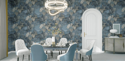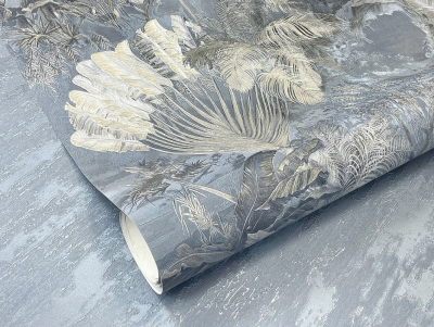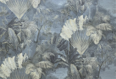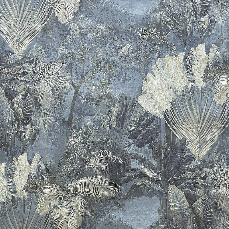 которые поднимаются над рекой ранним утром. Объединяет тропические мотивы компаньон, схожий с ними по структуре и рисунку, напоминающему туман. Он станет прекрасным фоном для интерьера в стиле минимализм или скандинавского лофта.