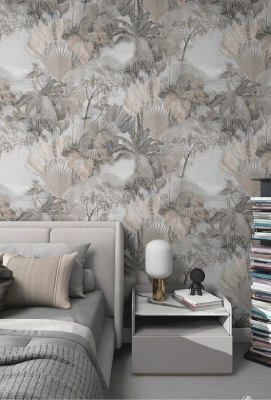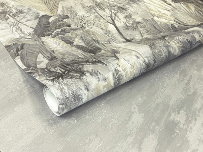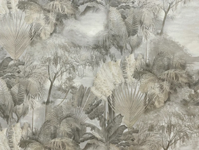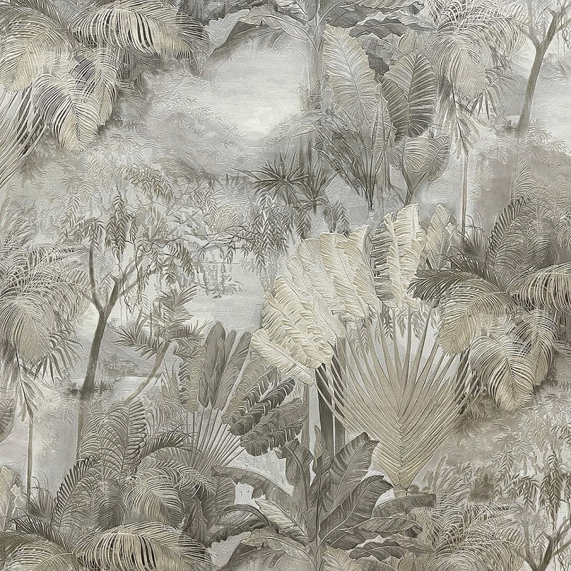 которые поднимаются над рекой ранним утром. Объединяет тропические мотивы компаньон, схожий с ними по структуре и рисунку, напоминающему туман. Он станет прекрасным фоном для интерьера в стиле минимализм или скандинавского лофта.