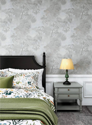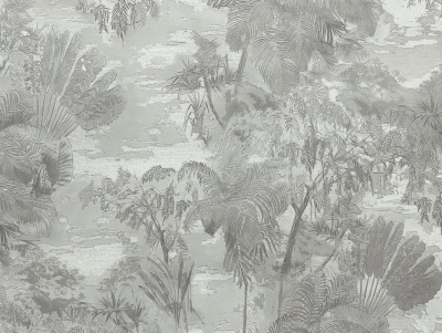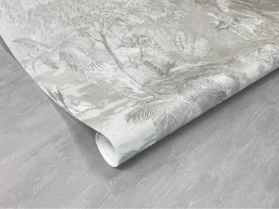 которые поднимаются над рекой ранним утром. Объединяет тропические мотивы компаньон, схожий с ними по структуре и рисунку, напоминающему туман. Он станет прекрасным фоном для интерьера в стиле минимализм или скандинавского лофта.