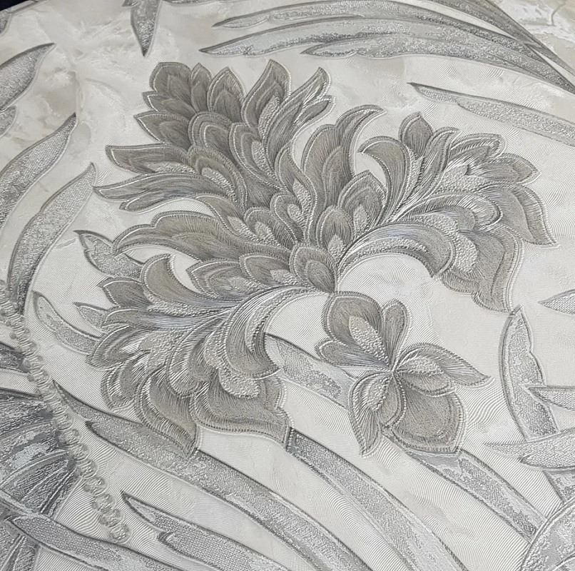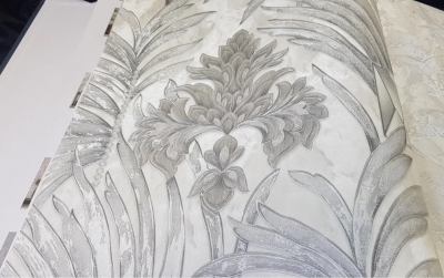 Рулонные обои Wiganford (Виганфорд) HK61425 мотив дамаск серебристый на серых листьях 1.06х10.05 м. винил на флизелине, Китай