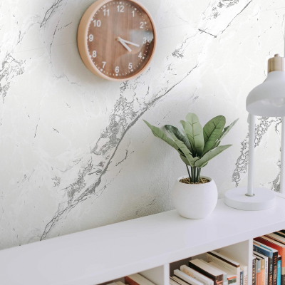 Рулонные обои Wiganford (Виганфорд) ER1706 мотив мрамор колотый белый с серебром 1.06х10.05 м. винил на флизелине, Китай