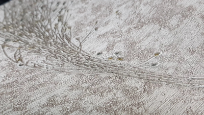 В первом сете представлена текстура с крупным растительным узором в приглушённых серо-бежевых тонах. Дополняет ее объемная, приятная на ощупь текстура набивной ткани в похожих оттенках. Во втором сете — мелкие веточки и невесомые линии. Продолжает этот мотив дизайн, имитирующий однотонную муаровую ткань.