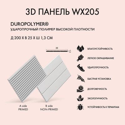 Линейные панели WX205 — это основа для вашего творчества. Прямоугольные и рифленые линии представлены в двух вариантах, тк панель можно использовать с двух сторон. Выбор за вами! RIPPLE и TRACK — это новейшие 3D панели из дюрополимера от Orac Decor, расширяют возможности ваших стен. Хорошее решение для создания защитного барьера стены для помещений с высокой проходимостью. Прогрунтована только сторона А. Для стороны B используйте два слоя финишной краски или сначала нанесите грунтовку, а потом финишную краску.